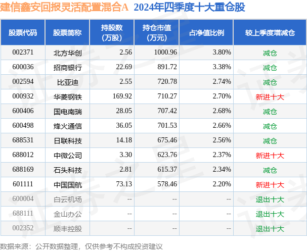 建信鑫安回报灵活配置混合A的前十大重仓股如下: