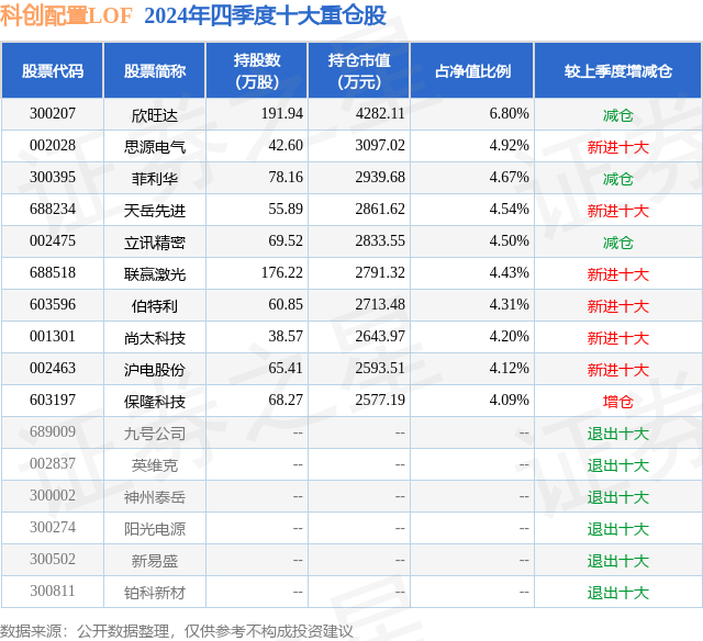 根据2024基金年报公募基金重仓股数据,重仓该股的公募基金共9家,其中持有数量最多的公募基金为科创配置LOF。科创配置LOF目前规模为6.3亿元,最新净值1.9118(2月25日),较上一交易日下跌0.22%,近一年上涨28.26%。该公募基金现任基金经理为李巍 贾乃鑫。李巍在任的基金产品包括:广发制造业精选混合A,管理时间为2011年9月20日至今,期间收益率为421.35%;广发新兴产业混合A,管理时间为2016年1月29日至今,期间收益率为130.41%;广发创业板两年定开混合,管理时间为2020年9月24日至今,期间收益率为-12.53%。