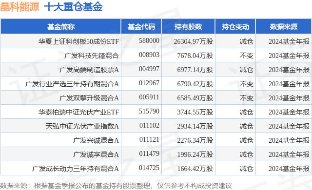 重仓晶科能源的前十大公募基金请见下表: