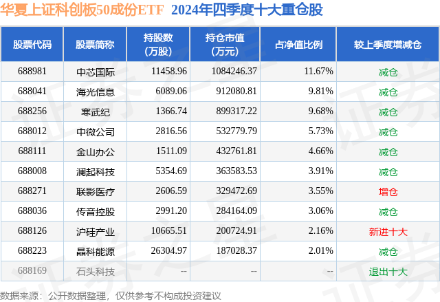 华夏上证科创板50成份ETF的前十大重仓股如下: