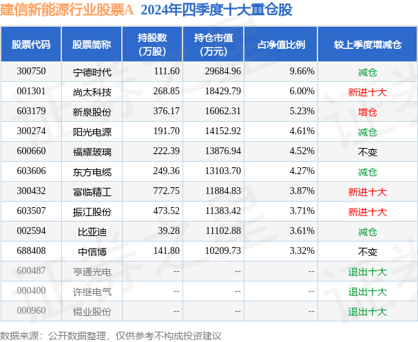 根据2024基金年报公募基金重仓股数据,重仓该股的公募基金共18家,其中持有数量最多的公募基金为建信新能源行业股票A。建信新能源行业股票A目前规模为27.04亿元,最新净值1.5555(2月25日),较上一交易日下跌0.19%,近一年上涨21.83%。该公募基金现任基金经理为陶灿 田元泉。陶灿在任的基金产品包括:建信改革红利股票A,管理时间为2014年5月14日至今,期间收益率为300.9%;建信高股息主题股票,管理时间为2020年1月21日至今,期间收益率为45.56%;建信兴润一年持有混合,管理时间为2021年8月24日至今,期间收益率为-31.88%。田元泉在任的基金产品包括:建信智能汽车股票,管理时间为2021年9月10日至今,期间收益率为-16.08%;建信研究精选混合A,管理时间为2024年6月12日至今,期间收益率为25.82%。