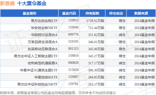 根据2024基金年报公募基金重仓股数据,重仓该股的公募基金共449家,其中持有数量最多的公募基金为易方达创业板ETF。易方达创业板ETF目前规模为915.0亿元,最新净值2.2251(2月26日),较上一交易日上涨1.23%,近一年上涨30.53%。该公募基金现任基金经理为成曦 刘树荣。成曦在任的基金产品包括:易方达深证100ETF联接A,管理时间为2016年5月7日至今,期间收益率为52.17%;易方达创业板ETF联接A,管理时间为2016年5月7日至今,期间收益率为7.61%;易方达深证100ETF,管理时间为2016年5月7日至今,期间收益率为47.21%;刘树荣在任的基金产品包括:易方达深证100ETF联接A,管理时间为2017年7月18日至今,期间收益率为31.58%;易方达创业板ETF联接A,管理时间为2017年7月18日至今,期间收益率为33.6%;易方达深证100ETF,管理时间为2017年7月18日至今,期间收益率为29.96%;