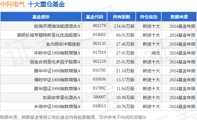 根据2024基金年报公募基金重仓股数据,重仓该股的公募基金共15家,其中持有数量最多的公募基金为前海开源清洁能源混合A。前海开源清洁能源混合A目前规模为4.89亿元,最新净值1.372(2月26日),较上一交易日上涨1.78%,近一年上涨21.63%。该公募基金现任基金经理为杨德龙。杨德龙在任的基金产品包括:前海开源深圳特区精选股票A,管理时间为2021年5月7日至今,期间收益率为-2.34%;前海开源优质龙头6个月持有混合A,管理时间为2021年7月9日至今,期间收益率为-30.51%;前海开源沪港深龙头精选混合,管理时间为2021年11月18日至今,期间收益率为-18.79%。