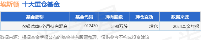 根据2024基金年报公募基金重仓股数据,重仓该股的公募基金共1家,其中持有数量最多的公募基金为农银瑞康6个月持有混合。农银瑞康6个月持有混合目前规模为0.5亿元,最新净值1.1076(2月26日),较上一交易日上涨0.44%,近一年上涨8.03%。该公募基金现任基金经理为郭振宇。郭振宇在任的基金产品包括:农银汇理金禄债券,管理时间为2019年2月2日至今,期间收益率为28.28%;农银汇理丰泽三年定开债,管理时间为2019年9月5日至今,期间收益率为17.08%;农银金盈债券A,管理时间为2019年9月17日至今,期间收益率为26.58%;农银汇理金益债券,管理时间为2019年12月9日至今,期间收益率为24.25%。