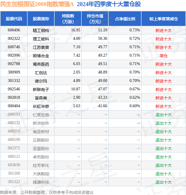 民生加银国证2000指数增强A的前十大重仓股如下: