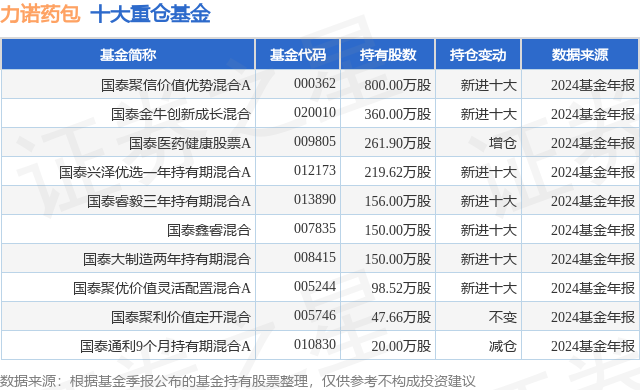 重仓力诺药包的前十大公募基金请见下表: