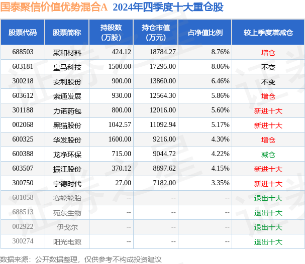 根据2024基金年报公募基金重仓股数据,重仓该股的公募基金共11家,其中持有数量最多的公募基金为国泰聚信价值优势混合A。国泰聚信价值优势混合A目前规模为13.63亿元,最新净值2.028(2月28日),较上一交易日下跌2.31%,近一年上涨12.23%。该公募基金现任基金经理为程洲。程洲在任的基金产品包括:国泰金牛创新成长混合,管理时间为2015年1月26日至今,期间收益率为94.09%;国泰大农业股票A,管理时间为2017年6月15日至今,期间收益率为57.34%;国泰聚优价值灵活配置混合A,管理时间为2017年11月15日至今,期间收益率为49.31%。