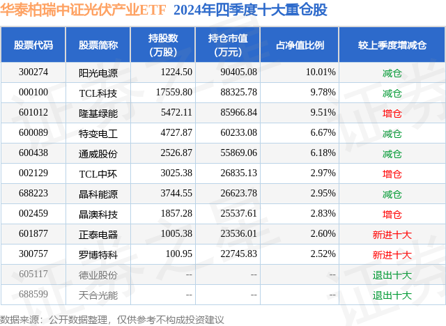 华泰柏瑞中证光伏产业ETF的前十大重仓股如下: