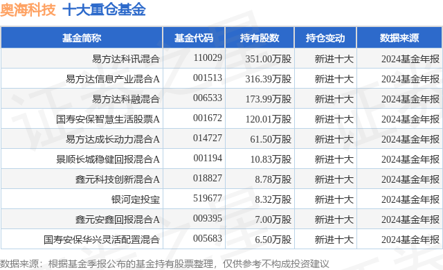 重仓奥海科技的前十大公募基金请见下表: