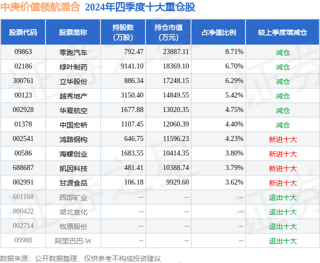 中庚价值领航混合的前十大重仓股如下:
