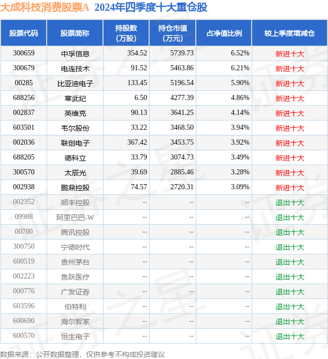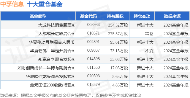 根据2024基金年报公募基金重仓股数据,重仓该股的公募基金共8家,其中持有数量最多的公募基金为大成科技消费股票A。大成科技消费股票A目前规模为6.45亿元,最新净值0.8173(3月3日),较上一交易日下跌1.35%,近一年上涨8.07%。该公募基金现任基金经理为杜聪。杜聪在任的基金产品包括:大成成长进取混合A,管理时间为2024年4月2日至今,期间收益率为41.34%;