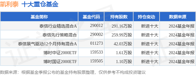 根据2024基金年报公募基金重仓股数据,重仓该股的公募基金共5家,其中持有数量最多的公募基金为泰信行业精选混合A。泰信行业精选混合A目前规模为2.88亿元,最新净值1.501(3月3日),较上一交易日上涨0.2%,近一年下跌9.02%。该公募基金现任基金经理为王博强 陈颖。王博强在任的基金产品包括:泰信先行策略混合,管理时间为2016年6月30日至今,期间收益率为-19.47%;泰信景气驱动12个月持有混合A,管理时间为2021年4月8日至今,期间收益率为-39.81%;泰信均衡价值混合A,管理时间为2021年12月22日至今,期间收益率为-33.43%;陈颖在任的基金产品包括:泰信医疗服务混合发起式A,管理时间为2022年1月17日至今,期间收益率为-7.2%;