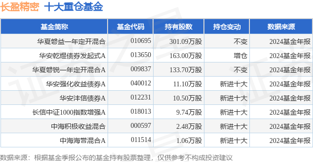 根据2024基金年报公募基金重仓股数据,重仓该股的公募基金共8家,其中持有数量最多的公募基金为华夏磐益一年定开混合。华夏磐益一年定开混合目前规模为6.93亿元,最新净值1.1582(3月3日),较上一交易日上涨1.52%,近一年上涨37.82%。该公募基金现任基金经理为张城源。张城源在任的基金产品包括:华夏磐泰混合(LOF)A,管理时间为2016年12月26日至今,期间收益率为66.92%;华夏磐利一年定开混合A,管理时间为2020年7月29日至今,期间收益率为60.09%;华夏磐锐一年定开混合A,管理时间为2020年12月22日至今,期间收益率为33.89%;