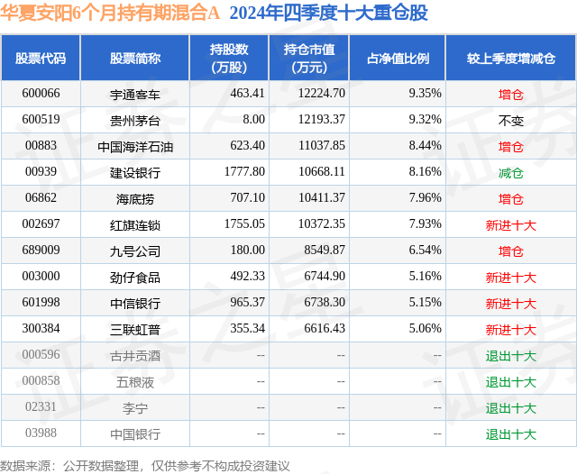 根据2024基金年报公募基金重仓股数据,重仓该股的公募基金共7家,其中持有数量最多的公募基金为华夏安阳6个月持有期混合A。华夏安阳6个月持有期混合A目前规模为11.55亿元,最新净值0.6952(3月3日),较上一交易日下跌0.46%,近一年上涨8.95%。该公募基金现任基金经理为林青泽。