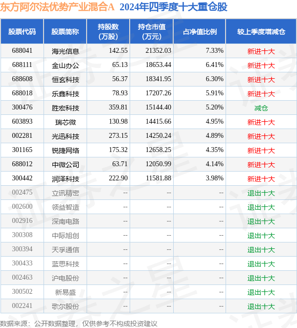 东方阿尔法优势产业混合A的前十大重仓股如下:
