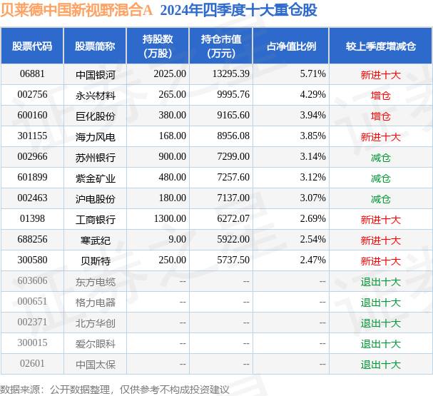 贝莱德中国新视野混合A的前十大重仓股如下: