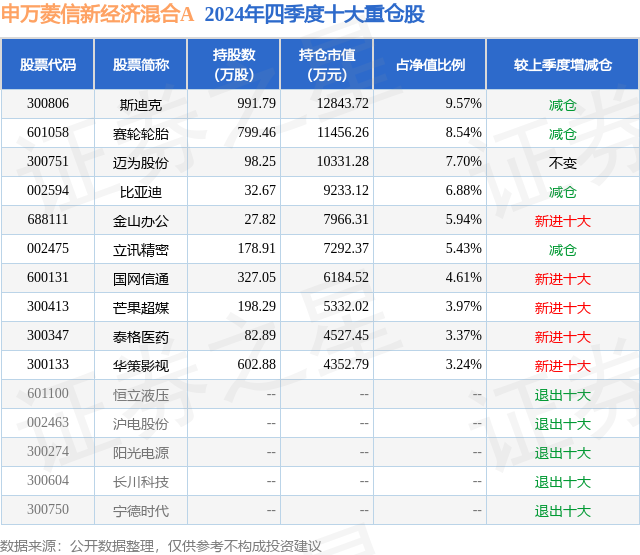 申万菱信新经济混合A的前十大重仓股如下: