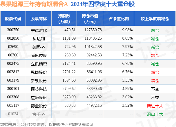 根据2024基金年报公募基金重仓股数据,重仓该股的公募基金共9家,其中持有数量最多的公募基金为泉果旭源三年持有期混合A。泉果旭源三年持有期混合A目前规模为109.41亿元,最新净值0.8247(3月4日),较上一交易日下跌0.45%,近一年上涨24.37%。该公募基金现任基金经理为赵诣。