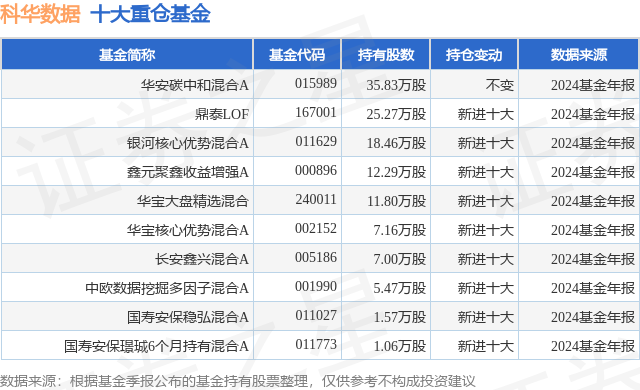 根据2024基金年报公募基金重仓股数据,重仓该股的公募基金共12家,其中持有数量最多的公募基金为华安碳中和混合A。华安碳中和混合A目前规模为1.66亿元,最新净值0.8624(3月4日),较上一交易日下跌0.16%,近一年上涨19.48%。该公募基金现任基金经理为蒋璆。蒋璆在任的基金产品包括:华安动态灵活配置混合A,管理时间为2015年6月16日至今,期间收益率为118.6%;华安制造先锋混合A,管理时间为2018年12月25日至今,期间收益率为176.58%;华安创业板两年定开混合,管理时间为2020年9月3日至今,期间收益率为35.53%;华安成长先锋混合A,管理时间为2021年2月23日至今,期间收益率为-10.44%。