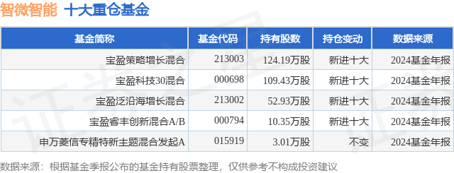 根据2024基金年报公募基金重仓股数据,重仓该股的公募基金共5家,其中持有数量最多的公募基金为宝盈策略增长混合。宝盈策略增长混合目前规模为9.53亿元,最新净值0.972(3月4日),较上一交易日上涨2.05%,近一年上涨28.79%。该公募基金现任基金经理为容志能。容志能在任的基金产品包括:宝盈转型动力混合A,管理时间为2023年3月17日至今,期间收益率为27.81%;宝盈国家安全沪港深股票A,管理时间为2023年3月17日至今,期间收益率为1.2%;宝盈创新驱动股票A,管理时间为2023年4月15日至今,期间收益率为2.96%;宝盈科技30混合,管理时间为2024年12月24日至今,期间收益率为6.08%。