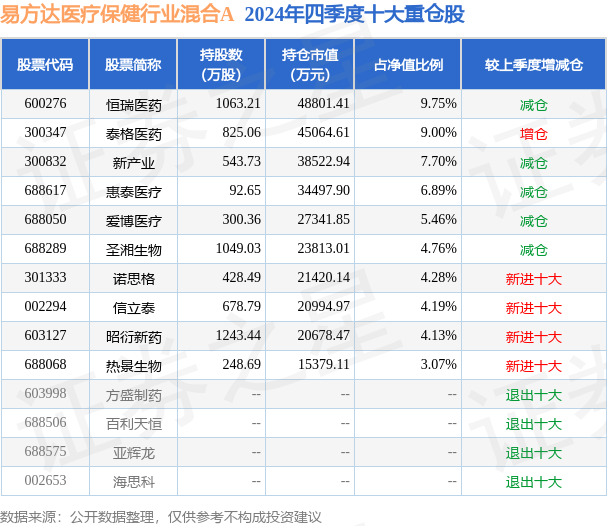 易方达医疗保健行业混合A的前十大重仓股如下: