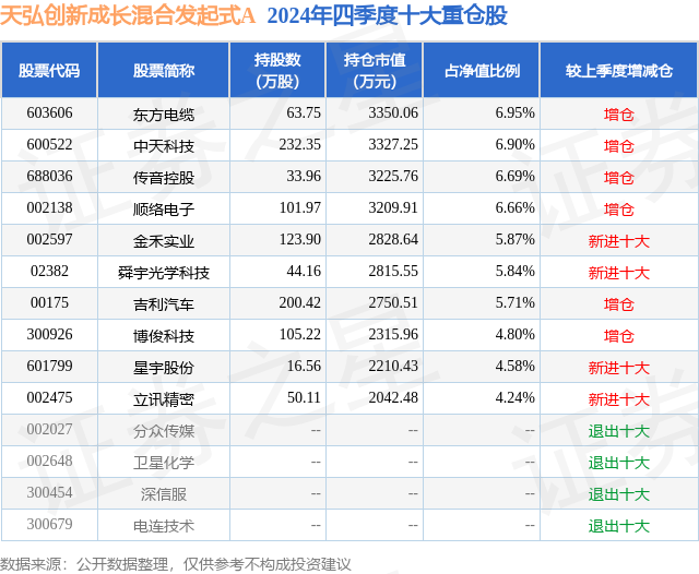 天弘创新成长混合发起式A的前十大重仓股如下: