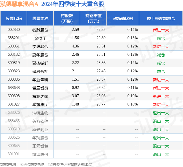 根据2024基金年报公募基金重仓股数据,重仓该股的公募基金共1家,其中持有数量最多的公募基金为泓德慧享混合A。泓德慧享混合A目前规模为2.37亿元,最新净值0.9599(3月5日),较上一交易日上涨0.03%,近一年上涨11.94%。该公募基金现任基金经理为赵端端 姚学康。姚学康在任的基金产品包括:泓德裕和纯债债券A,管理时间为2021年12月31日至今,期间收益率为9.0%;泓德睿享一年持有期混合A,管理时间为2022年3月24日至今,期间收益率为14.55%;赵端端在任的基金产品包括:泓德裕荣纯债债券A,管理时间为2018年9月25日至今,期间收益率为24.58%;泓德裕祥债券A,管理时间为2019年1月15日至今,期间收益率为31.1%;泓德睿享一年持有期混合A,管理时间为2020年6月24日至今,期间收益率为31.6%;泓德裕泰债券A,管理时间为2021年6月18日至今,期间收益率为22.25%。
