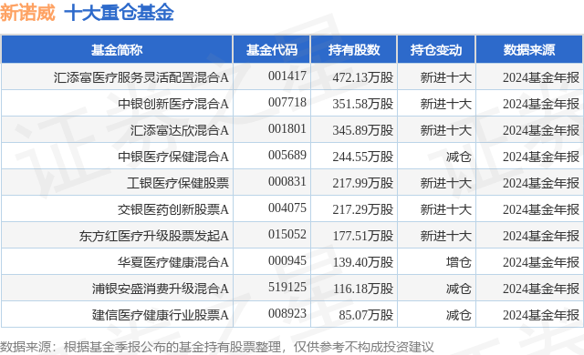 根据2024基金年报公募基金重仓股数据,重仓该股的公募基金共26家,其中持有数量最多的公募基金为汇添富医疗服务灵活配置混合A。汇添富医疗服务灵活配置混合A目前规模为35.59亿元,最新净值1.295(3月5日),较上一交易日下跌0.15%,近一年上涨4.6%。该公募基金现任基金经理为张韡。张韡在任的基金产品包括:汇添富健康生活一年持有混合A,管理时间为2021年3月25日至今,期间收益率为-3.88%;汇添富香港优势精选混合(QDII)A,管理时间为2021年9月29日至今,期间收益率为-31.0%;汇添富达欣混合A,管理时间为2022年10月21日至今,期间收益率为9.28%;