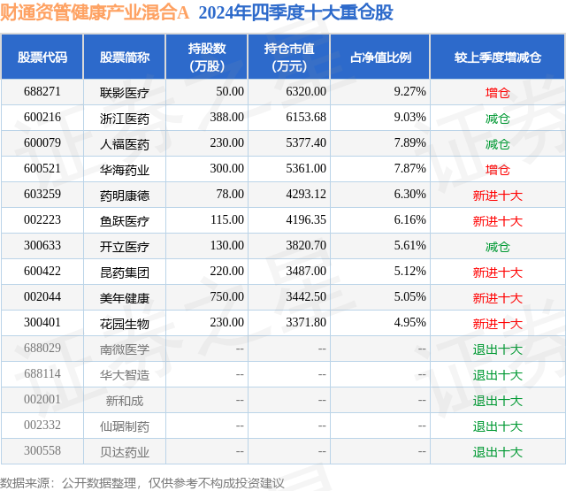 财通资管健康产业混合A的前十大重仓股如下: