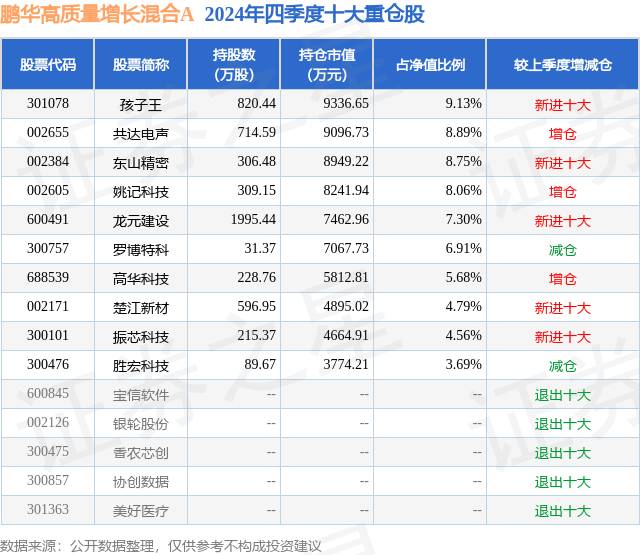 鹏华高质量增长混合A的前十大重仓股如下: