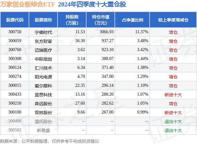 万家创业板综合ETF的前十大重仓股如下: