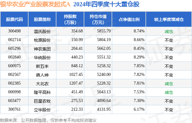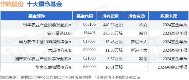 根据2024基金年报公募基金重仓股数据,重仓该股的公募基金共5家,其中持有数量最多的公募基金为银华基金的银华农业产业股票发起式A。银华农业产业股票发起式A目前规模为5.74亿元,最新净值1.2364(3月7日),较上一交易日上涨0.24%,近一年下跌20.54%。该公募基金现任基金经理为唐能。唐能在任的基金产品包括:银华和谐主题混合,管理时间为2015年5月25日至今,期间收益率为8.64%;银华瑞泰灵活配置混合,管理时间为2018年12月27日至今,期间收益率为65.96%;银华科创主题灵活配置混合(LOF),管理时间为2019年7月5日至今,期间收益率为30.4%;银华科技创新混合,管理时间为2020年1月16日至今,期间收益率为0.76%。
