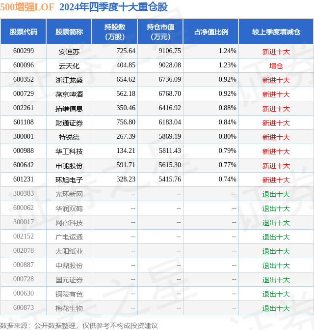 500增强LOF的前十大重仓股如下:
