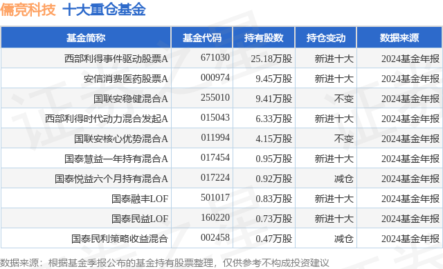 重仓儒竞科技的前十大公募基金请见下表: