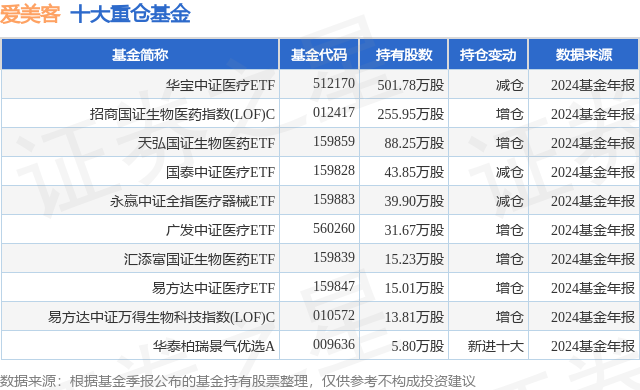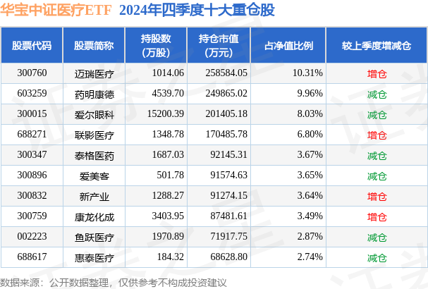 根据2024基金年报公募基金重仓股数据,重仓该股的公募基金共30家,其中持有数量最多的公募基金为华宝基金的华宝中证医疗ETF。华宝中证医疗ETF目前规模为250.79亿元,最新净值0.3501(3月10日),较上一交易日上涨0.69%,近一年上涨1.42%。该公募基金现任基金经理为胡洁。胡洁在任的基金产品包括:华宝中证银行ETF联接A,管理时间为2012年10月16日至今,期间收益率为157.39%;华宝医疗ETF联接A,管理时间为2015年5月21日至今,期间收益率为-61.45%;华宝中证军工ETF,管理时间为2016年8月5日至今,期间收益率为23.59%;华宝中证银行ETF,管理时间为2017年7月18日至今,期间收益率为49.57%。