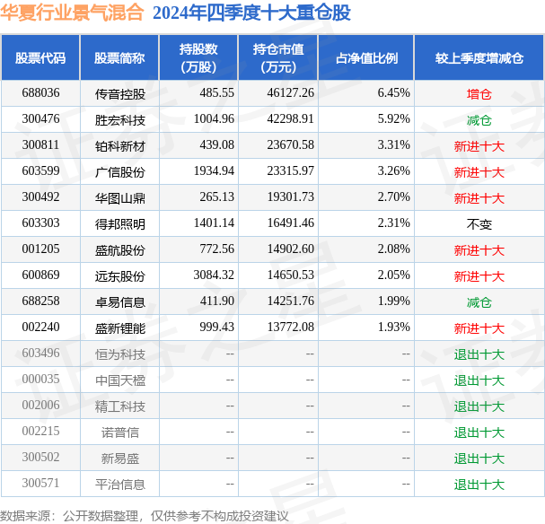 根据2024基金年报公募基金重仓股数据,重仓该股的公募基金共115家,其中持有数量最多的公募基金为华夏基金的华夏行业景气混合。华夏行业景气混合目前规模为71.48亿元,最新净值3.3216(3月10日),较上一交易日上涨0.95%,近一年上涨26.61%。该公募基金现任基金经理为钟帅。钟帅在任的基金产品包括:华夏远见成长一年持有混合A,管理时间为2022年9月20日至今,期间收益率为-0.37%;华夏招鑫鸿瑞混合A,管理时间为2024年1月16日至今,期间收益率为46.54%。