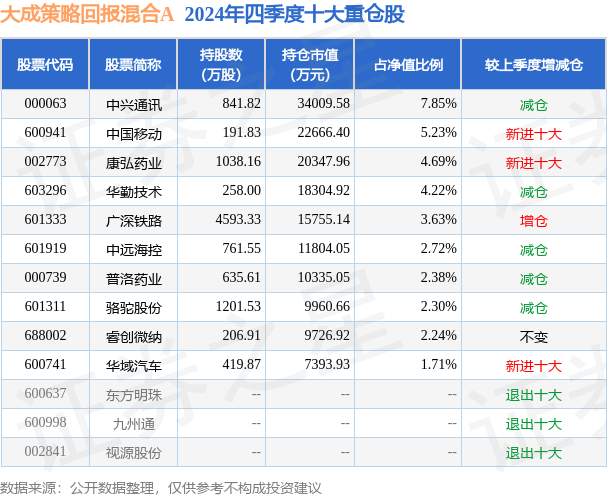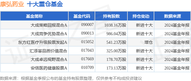 根据2024基金年报公募基金重仓股数据,重仓该股的公募基金共6家,其中持有数量最多的公募基金为大成基金的大成策略回报混合A。大成策略回报混合A目前规模为35.15亿元,最新净值1.1299(3月10日),较上一交易日上涨0.55%,近一年上涨17.13%。该公募基金现任基金经理为徐彦。徐彦在任的基金产品包括:大成睿享混合A,管理时间为2019年12月30日至今,期间收益率为86.91%;大成竞争优势混合A,管理时间为2019年12月30日至今,期间收益率为102.91%;大成投资严选六月持有混合A,管理时间为2021年7月16日至今,期间收益率为29.94%。