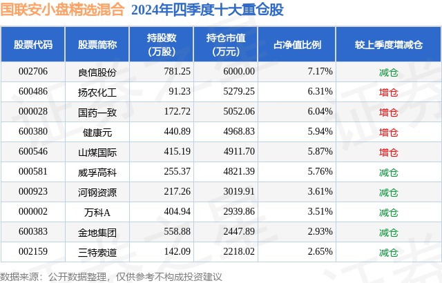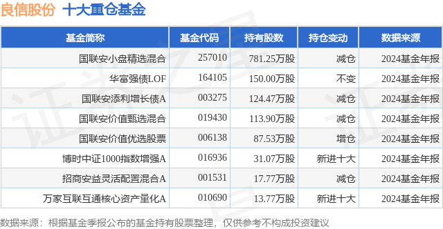 根据2024基金年报公募基金重仓股数据,重仓该股的公募基金共8家,其中持有数量最多的公募基金为国联安基金的国联安小盘精选混合。国联安小盘精选混合目前规模为8.37亿元,最新净值1.003(3月10日),较上一交易日上涨0.91%,近一年上涨11.07%。该公募基金现任基金经理为邹新进。邹新进在任的基金产品包括:国联安价值优选股票,管理时间为2018年9月20日至今,期间收益率为97.58%;国联安添利增长债A,管理时间为2019年12月31日至今,期间收益率为29.35%;国联安价值甄选混合,管理时间为2024年5月14日至今,期间收益率为10.66%。