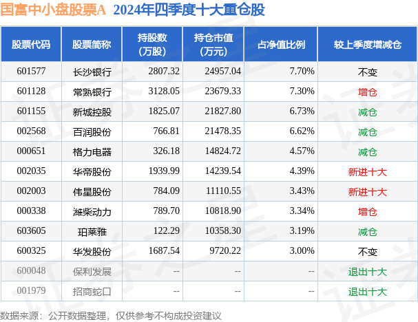 根据2024基金年报公募基金重仓股数据,重仓该股的公募基金共57家,其中持有数量最多的公募基金为国海富兰克林基金的国富中小盘股票A。国富中小盘股票A目前规模为31.47亿元,最新净值2.488(3月10日),较上一交易日下跌0.4%,近一年上涨11.87%。该公募基金现任基金经理为赵晓东。赵晓东在任的基金产品包括:国富弹性市值混合A,管理时间为2014年12月19日至今,期间收益率为192.41%;国富恒瑞债券A,管理时间为2016年2月4日至今,期间收益率为60.52%;国富基本面优选混合A,管理时间为2020年2月13日至今,期间收益率为70.69%。