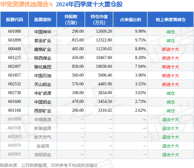 华宝资源优选混合A的前十大重仓股如下: