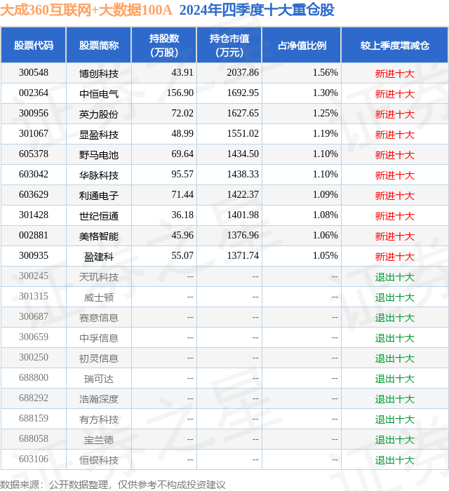大成360互联网+大数据100A的前十大重仓股如下: