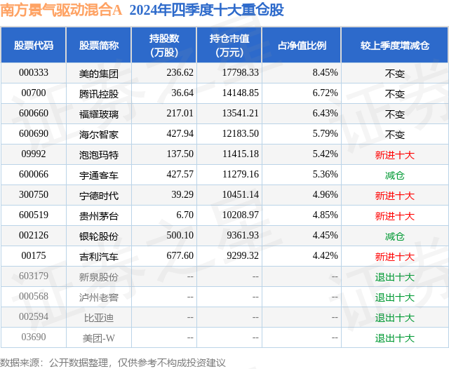 根据2024基金年报公募基金重仓股数据,重仓该股的公募基金共43家,其中持有数量最多的公募基金为南方基金的南方景气驱动混合A。南方景气驱动混合A目前规模为16.98亿元,最新净值0.6875(3月12日),较上一交易日下跌0.65%,近一年上涨10.37%。该公募基金现任基金经理为郑诗韵。郑诗韵在任的基金产品包括:南方新兴消费增长股票(LOF)C,管理时间为2020年11月17日至今,期间收益率为-26.9%;南方消费升级混合A,管理时间为2022年7月22日至今,期间收益率为2.46%。