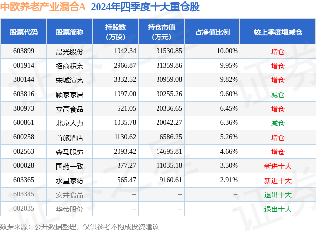 中欧养老产业混合A的前十大重仓股如下: