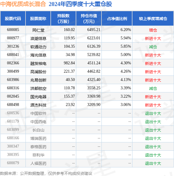 根据2024基金年报公募基金重仓股数据,重仓该股的公募基金共5家,其中持有数量最多的公募基金为中海基金的中海优质成长混合。中海优质成长混合目前规模为10.48亿元,最新净值0.3127(3月13日),较上一交易日下跌1.11%,近一年上涨7.02%。该公募基金现任基金经理为许定晴。许定晴在任的基金产品包括:中海进取收益混合,管理时间为2016年7月29日至今,期间收益率为16.31%;中海海颐混合A,管理时间为2021年11月16日至今,期间收益率为-0.5%。