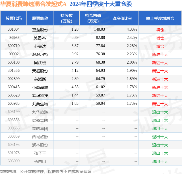 华夏消费臻选混合发起式A的前十大重仓股如下: