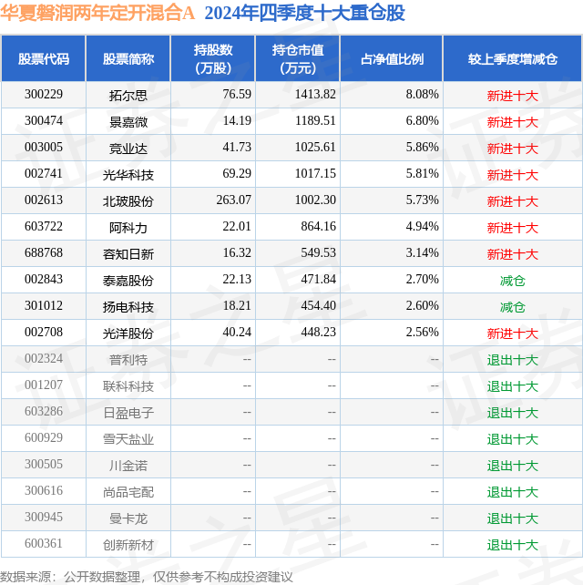 华夏磐润两年定开混合A的前十大重仓股如下: