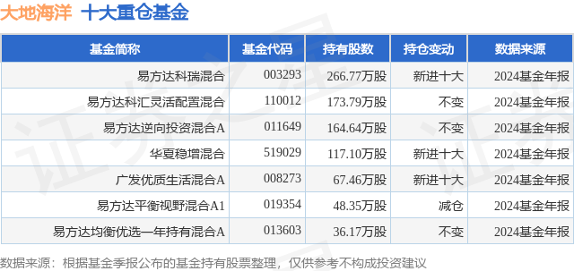 根据2024基金年报公募基金重仓股数据,重仓该股的公募基金共7家,其中持有数量最多的公募基金为易方达基金的易方达科瑞混合。易方达科瑞混合目前规模为15.94亿元,最新净值1.7518(3月17日),较上一交易日下跌0.22%,近一年下跌1.61%。该公募基金现任基金经理为杨嘉文。杨嘉文在任的基金产品包括:易方达科汇灵活配置混合,管理时间为2019年11月28日至今,期间收益率为71.64%;易方达逆向投资混合A,管理时间为2021年4月1日至今,期间收益率为1.85%;易方达均衡优选一年持有混合A,管理时间为2022年5月26日至今,期间收益率为15.55%。