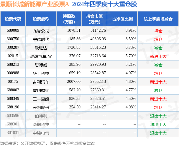 根据2024基金年报公募基金重仓股数据,重仓该股的公募基金共12家,其中持有数量最多的公募基金为景顺长城基金的景顺长城新能源产业股票A。景顺长城新能源产业股票A目前规模为23.79亿元,最新净值1.2273(3月17日),较上一交易日下跌0.36%,近一年上涨30.43%。该公募基金现任基金经理为杨锐文 曾英捷。杨锐文在任的基金产品包括:景顺长城优选混合,管理时间为2014年10月25日至今,期间收益率为283.71%;景顺长城环保优势股票,管理时间为2016年3月15日至今,期间收益率为251.2%;景顺长城创新成长混合,管理时间为2019年10月17日至今,期间收益率为77.35%;景顺长城成长领航混合,管理时间为2020年5月28日至今,期间收益率为47.34%。