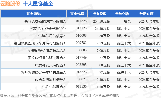 重仓云路股份的前十大公募基金请见下表:
