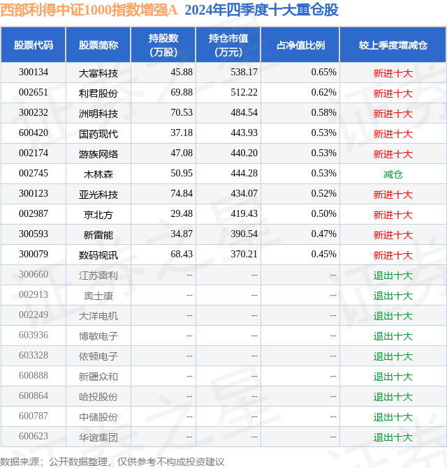 西部利得中证1000指数增强A的前十大重仓股如下: